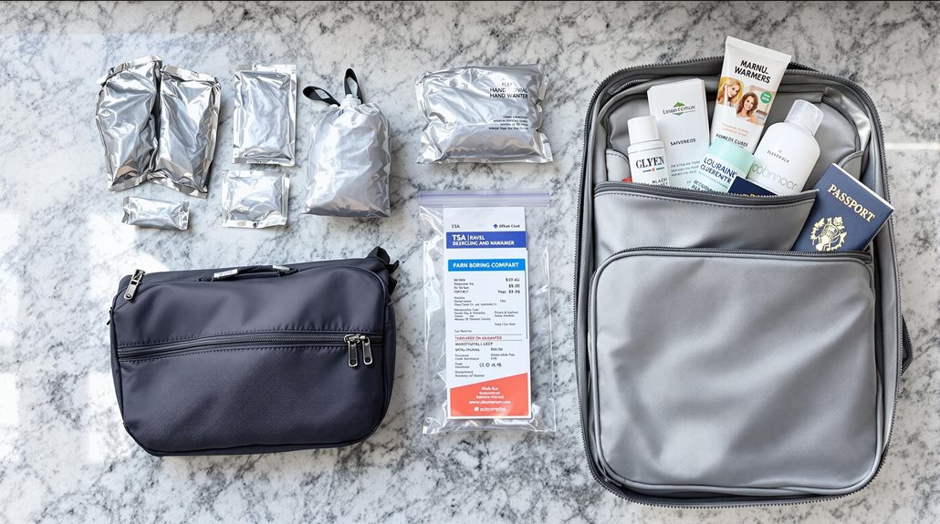 You can bring most types of hand warmers on planes, but you’ll need to follow specific TSA guidelines. Air-activated and disposable chemical hand warmers are generally allowed in both carry-on and checked bags when they’re properly sealed and new. For carry-ons, keep them easily accessible for security screening, similar to electronics. Catalytic hand warmers that use lighter fluid aren’t permitted in either carry-on or checked luggage due to their flammable nature. Battery-operated warmers are allowed but may require additional screening. Pack them in clear, sealed bags and keep original packaging when possible. Understanding the specific regulations for your hand warmer type will guarantee a smooth security process.